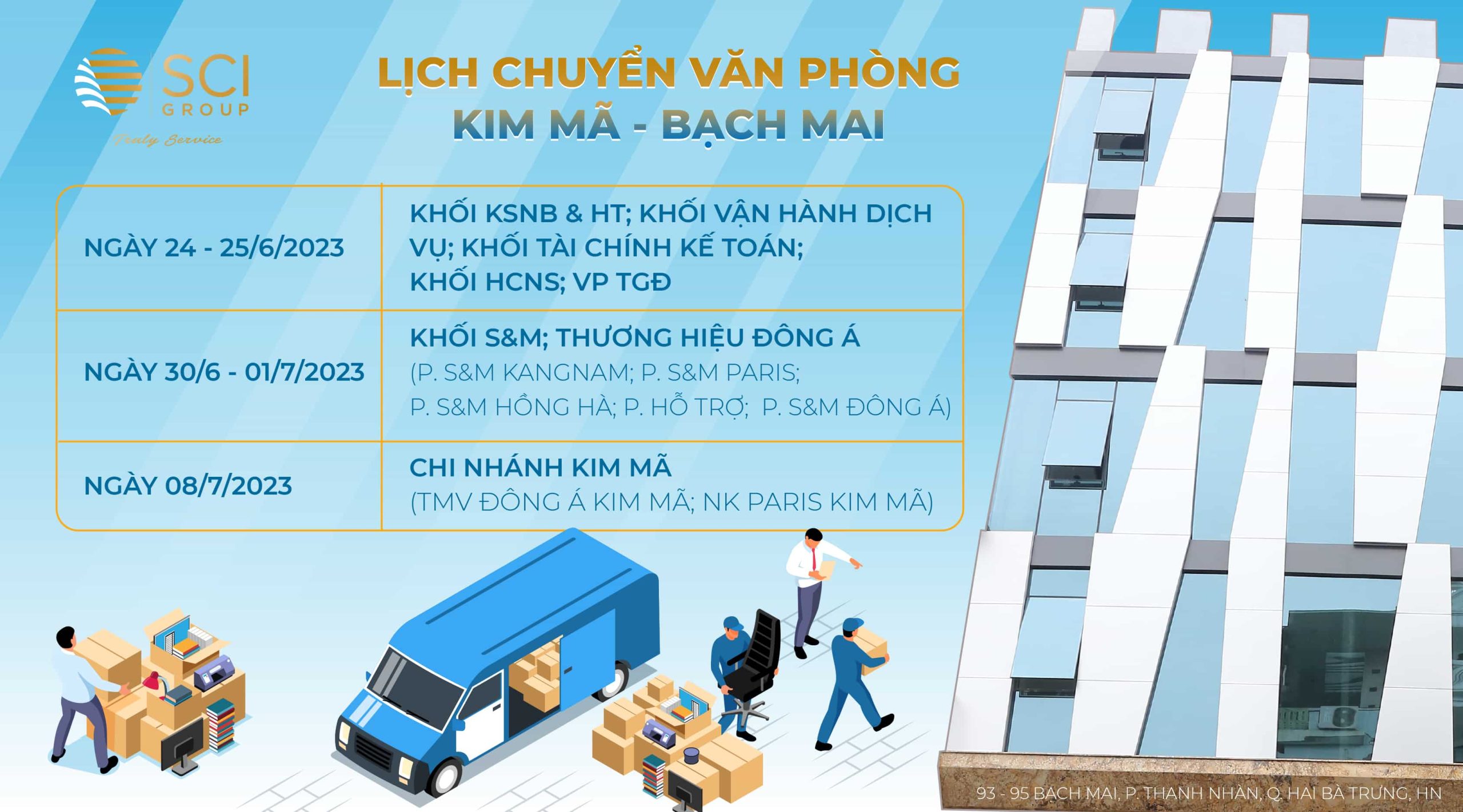 Đợt 3: Diễn ra từ 08/07/2023, Chi nhánh Kim Mã (TMV Đông Á Kim Mã – Paris Kim Mã) là đợt chuyển văn phòng cuối cùng, đánh dấu sự hoàn thành toàn bộ quy trình chuyển đổi văn phòng làm việc từ Kim Mã sang Bạch Mai của Tập đoàn SCI.